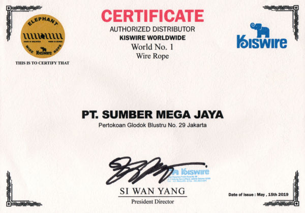 Solusi yang ditawarkan membuat kiswire menjadi produsen yang banyak diandalkan oleh para pelaku industri konstruksi hingga transportasi. Berkantor pusat di Busan, Korea, Kiswire selalu berkomitmen untuk mendorong terwujudnya dunia yang lebih baik melalui produk-produk yang dimiliki. Mega Jaya sebagai distributor jual wire rope kiswire ikut andil dalam perkembangan wire rope kiswire yang beredar di Indonesia. Hal tersebut dibuktikan melalui sertifikat authorized distributor yang diberikan kiswire kepada PT Sumber Mega Jaya.
