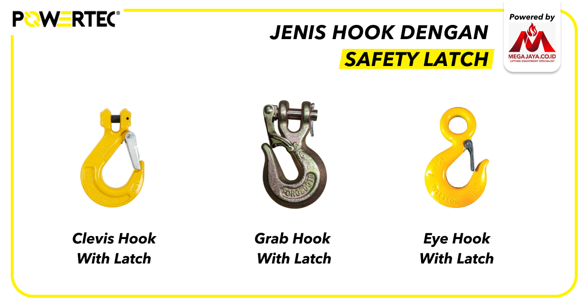 Beberapa jenis hook yang dilengkapi latch pengaman antara lain safety latch hook (sling hook), clevis hook with latch, eye hook with latch, dan grab hook with latch. Masing-masing memiliki desain yang disesuaikan dengan kebutuhan dan jenis sling yang digunakan.