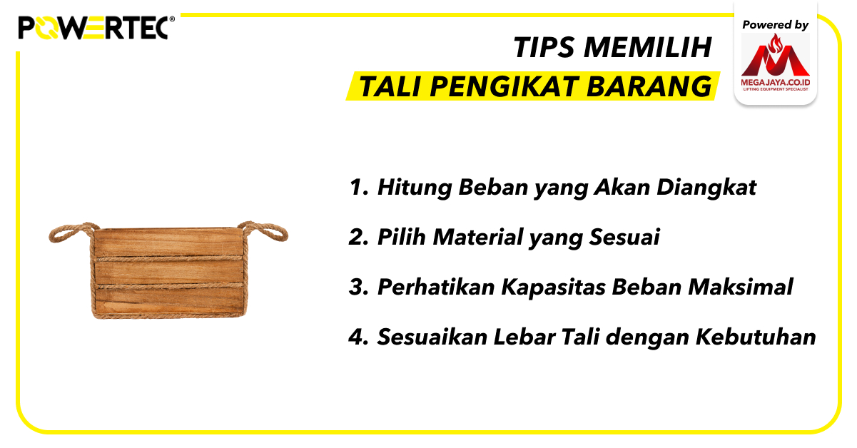 Pertama, perhitungkan berat dan ukuran barang. Lalu pilih material yang sesuai (polyester, nilon, atau baja). Perhatikan juga kapasitas beban maksimal dan lebar tali agar daya ikat lebih optimal.