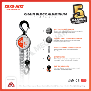 - Chain Block Hoist Toyo 0.5 Ton dengan ukuran panjang rantai 3 meter, 5 meter, 7 meter, 10 meter, 12 meter, 15 meter, dan 20 meter.