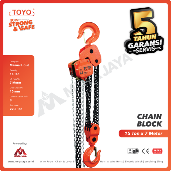 Dengan kapasitas angkat hingga 15 ton dan panjang rantai 7 Meter, chain block ini dirancang untuk memaksimalkan efisiensi kerja dengan keamanan yang terjamin. Untuk melihat varian chain block toyo lainnya Anda bisa cek di halaman chain block toyo.Â