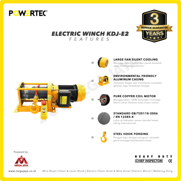 Fungsi utama electric winch powertec KDJ-E2 ditujukan sebagai produk lifting yang berfungsi untuk menarik beban secara horisontal menggunakan winch machine. Meski secara khusus didesain untuk menarik beban horisontal, tapi winch juga bisa digunakan mengangkat beban. Alat ini sangat efisien dan fleksibel sehingga bisa membantu meringankan aplikasi handling.
