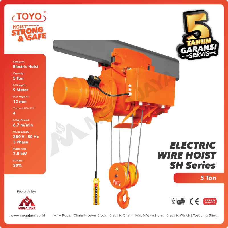 Electric Wire Rope Hoist 3F Toyo SH + Trolley 5 Ton x 9 Meter