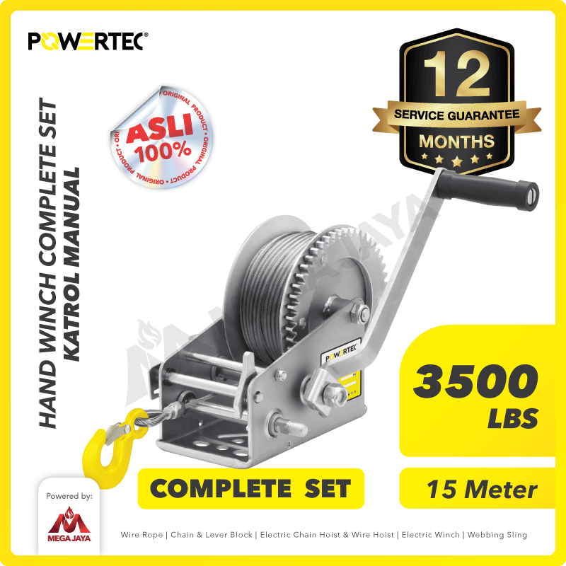 Hand Winch Powertec 3500 Lbs / 1600 Kg x 15 Meter (Complete Set)