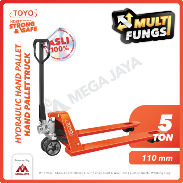 Jika Anda memiliki beban yang harus diangkut dengan bobot yang cukup berat baik itu dari 1 ton hingga 5 ton, Anda dapat menggunakan hand pallet dengan kapasitas 5 ton. Memilih hand lift 5 ton membuat Anda lebih leluasa mengangkut beban berat tanpa memperberat kerja operator. Salah satunya adalah Hydraulic Hand Pallet 5 Ton Toyo. Dapatkan produk hand pallet terbaik hanya di Megajaya.co.id dengan harga yang kompetitif!