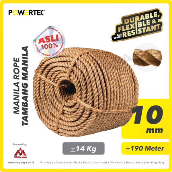 Memilih produk manila rope dari Powertec karena menawarkan banyak kelebihan, selain harga tali tambang 10 mm dari Powertec yang terjangkau. Kekuatan tali tambang produk ini sudah diuji sehingga pemakaiannya lebih aman. Produk ini lebih tahan terhadap paparan atau percikan air asin dan air tawar, tahan untuk penggunaan alat-alat berat serta tidak menyerap banyak air jadi tidak akan menambah bobot pada benda yang ditarik/diangkat.