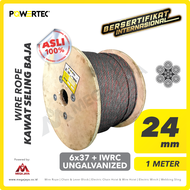 Wire rope 6×37 + IWRC Ungalv 24mm termasuk jenis kawat seling yang diproduksi Powertec dengan konstruksi 6 strand dan terdapat 37 kawat penyusun pada tiap strand. Dalam satu strand, Powertec menyematkan satu inti baja sehingga struktur keseluruhan menjadi lebih kuat.
